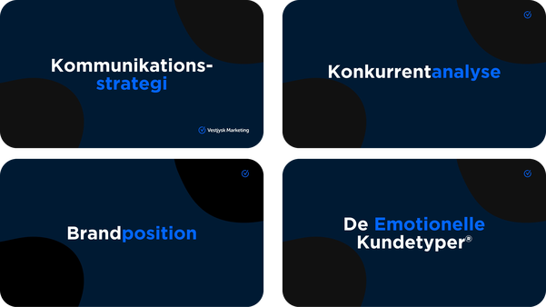Vi arbejder med kundetyper, værdier, positionering og jeres tone of voice. Vi graver os ned i virkeligheden, jeres udfordringer og jeres mål.